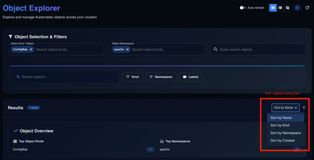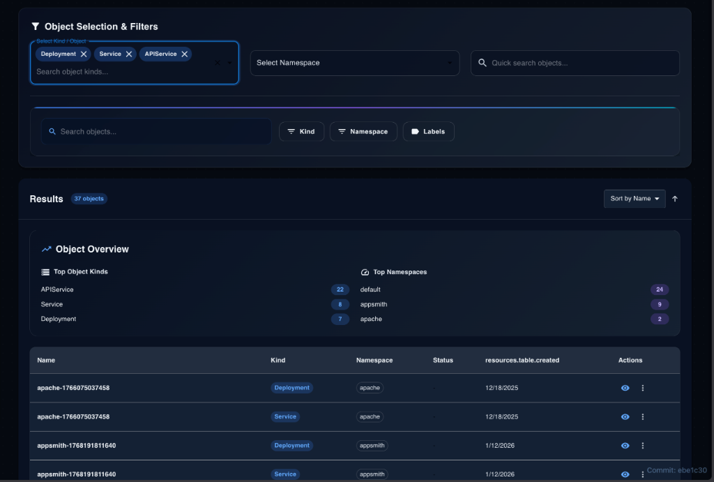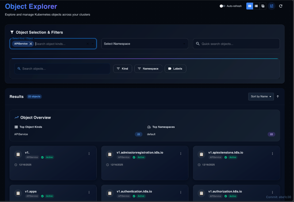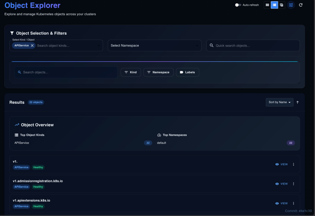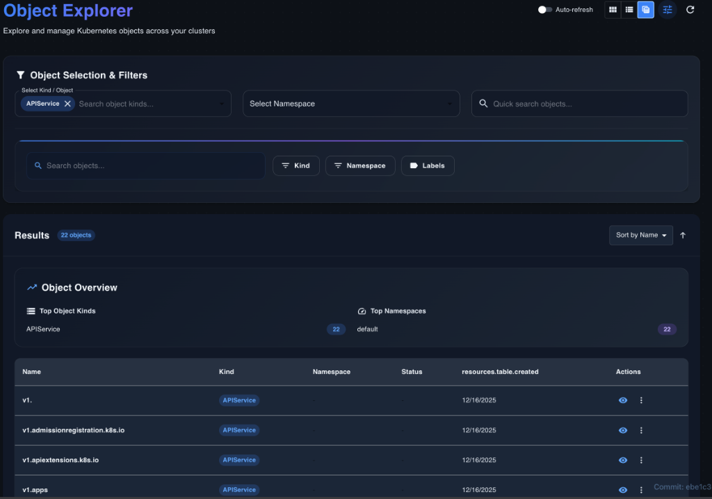 - Powerful filtering: Drill down by kind, namespace, status, age, and labels.