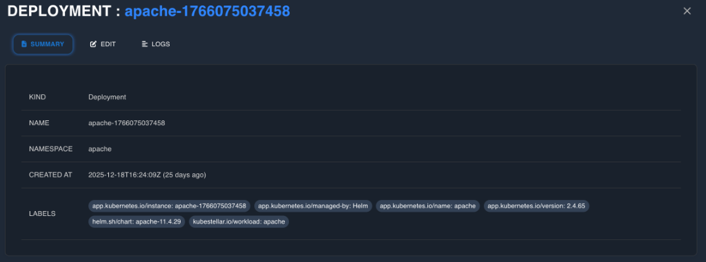 - Summary View: Metadata, Owner References, Labels/Annotations (editable), and Status Conditions.